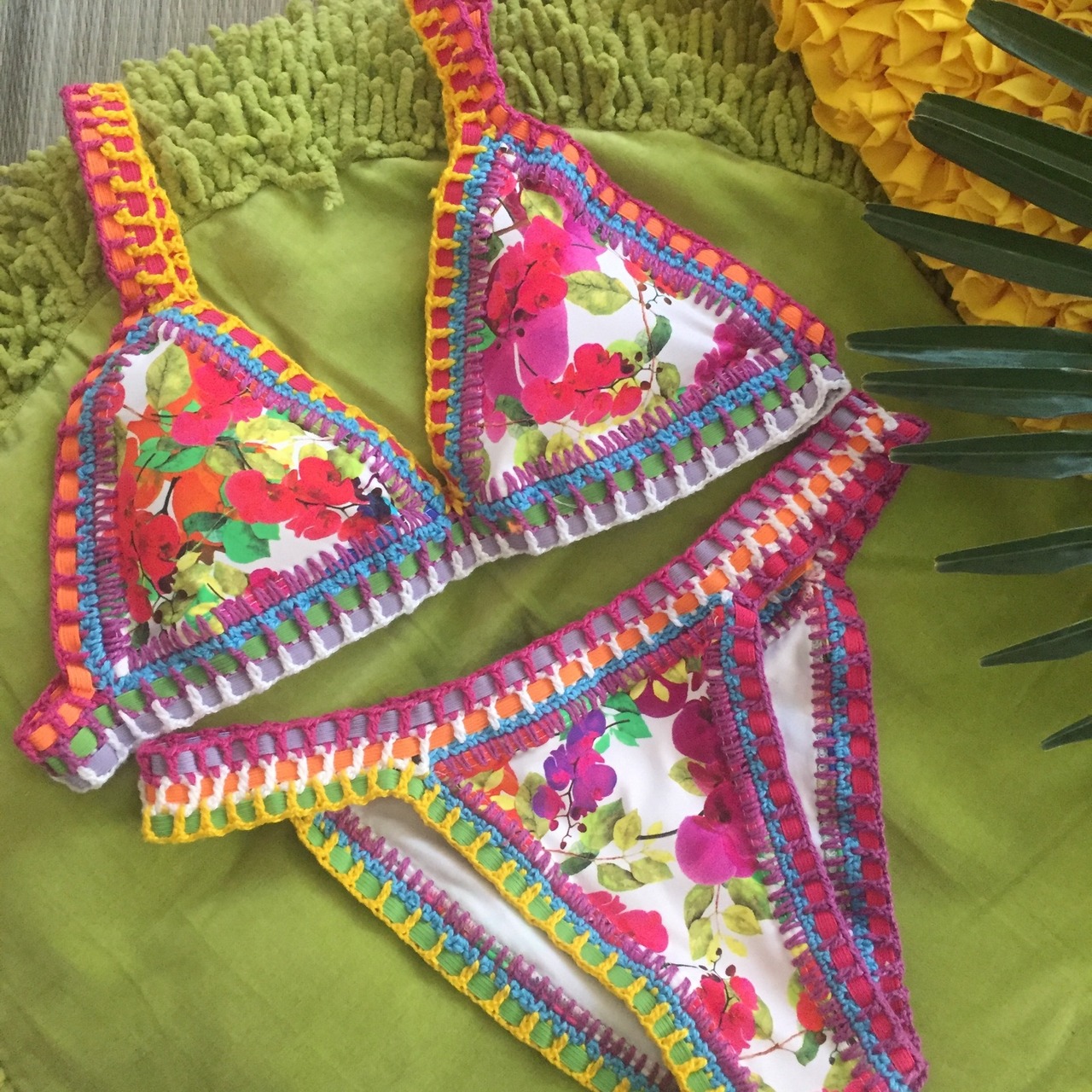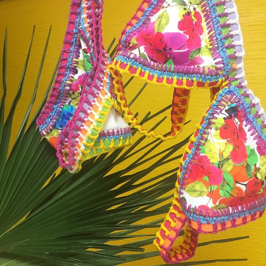 手編みのカラフルクロッシェが素敵なブラジリアンビキニ。